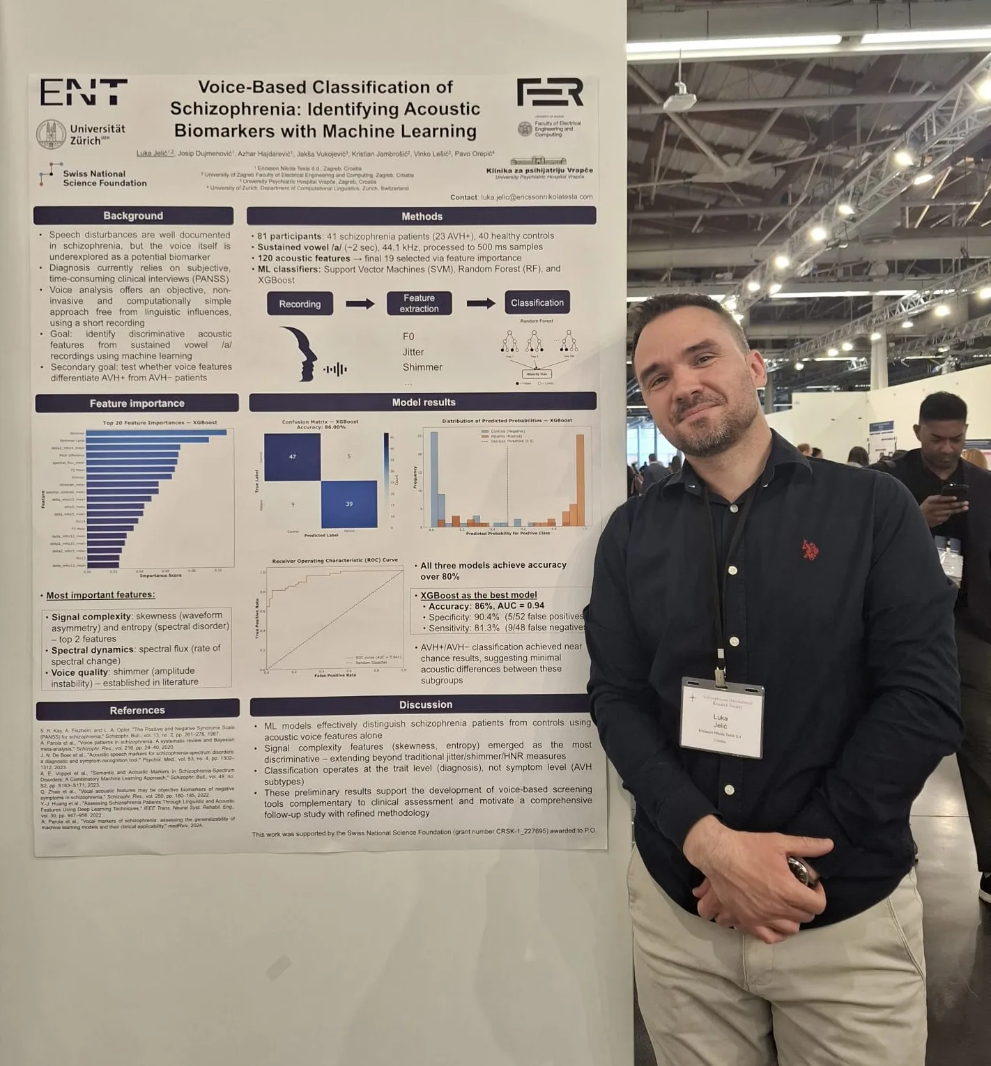 Luka Jelić iz ENT-a koji je u suradnji s liječnicima Klinike za psihijatriju „Vrapče“ proveo zagrebački dio istraživanja, na spomenutom je kongresu u Firenci predstavio projekt koji koristi strojno učenje za razlikovanje zdravih ispitanika od pacijenata sa shizofrenijom na temelju glasa.